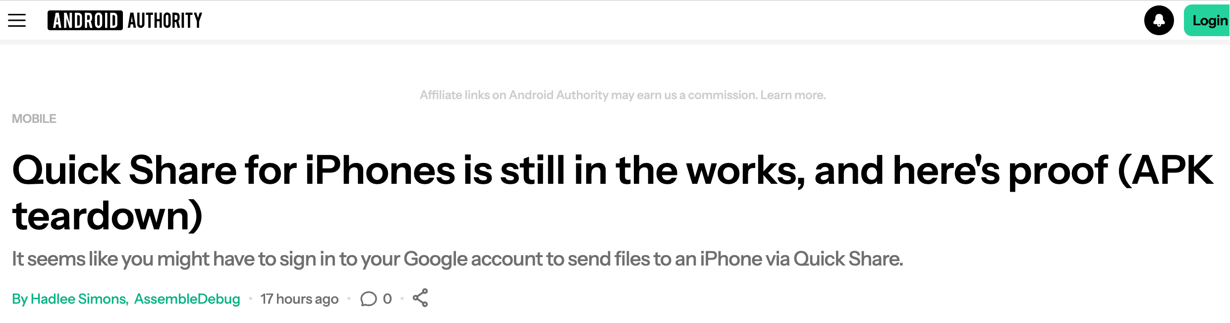 【环球网科技综合报道】8月26日消息,据外媒报道,谷歌正悄然推进一项可能重塑移动设备文件传输格局的计划:为苹果iOS系统开发兼容安卓的“快速分享”(Quick Share)功能。